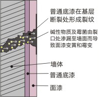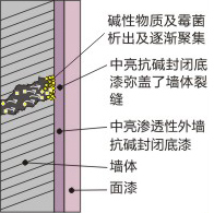 圖1:普通底庥無法完全彌蓋墻體的裂紋,因此基層的堿性物質(zhì)霉菌會隨裂紋析出達(dá)到面漆部位,導(dǎo)致面漆變黃和污損。 圖2:中亮抗堿封閉底漆可以完全彌蓋墻體的裂紋,因此基層裂紋聚集的堿性物質(zhì)和霉菌被阻止析出到面漆部位,使墻面長久保持亮麗。 |